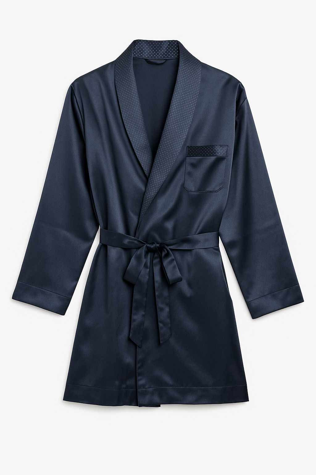 Perfect pentru bărbații care apreciază materialele delicate și finisajele elegante, acest halat din satin adaugă o notă de lux rutinei zilnice.