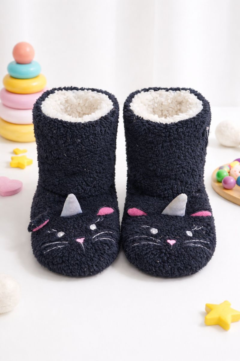 Papucii de casă pentru copii, model pisicuță, sunt alegerea ideală pentru confortul celor mici în sezonul rece. Realizați din material textil moale și pufos, acești papuci oferă o senzație plăcută la purtare și mențin picioarele copilului calde pe tot parcursul zilei.
