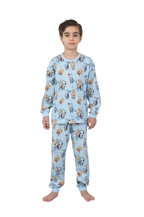 Setul este alcătuit din bluza cu maneca lunga și pantaloni lungi cu manșetă, realizate din bumbac moale și plăcut la atingere, ideal pentru pielea sensibilă a copiilor. Designul modern, în nuanță de albastru, este animat cu personaje din desenele cu Blue simpatici, care adaugă un plus de distracție ținutelor de noapte.