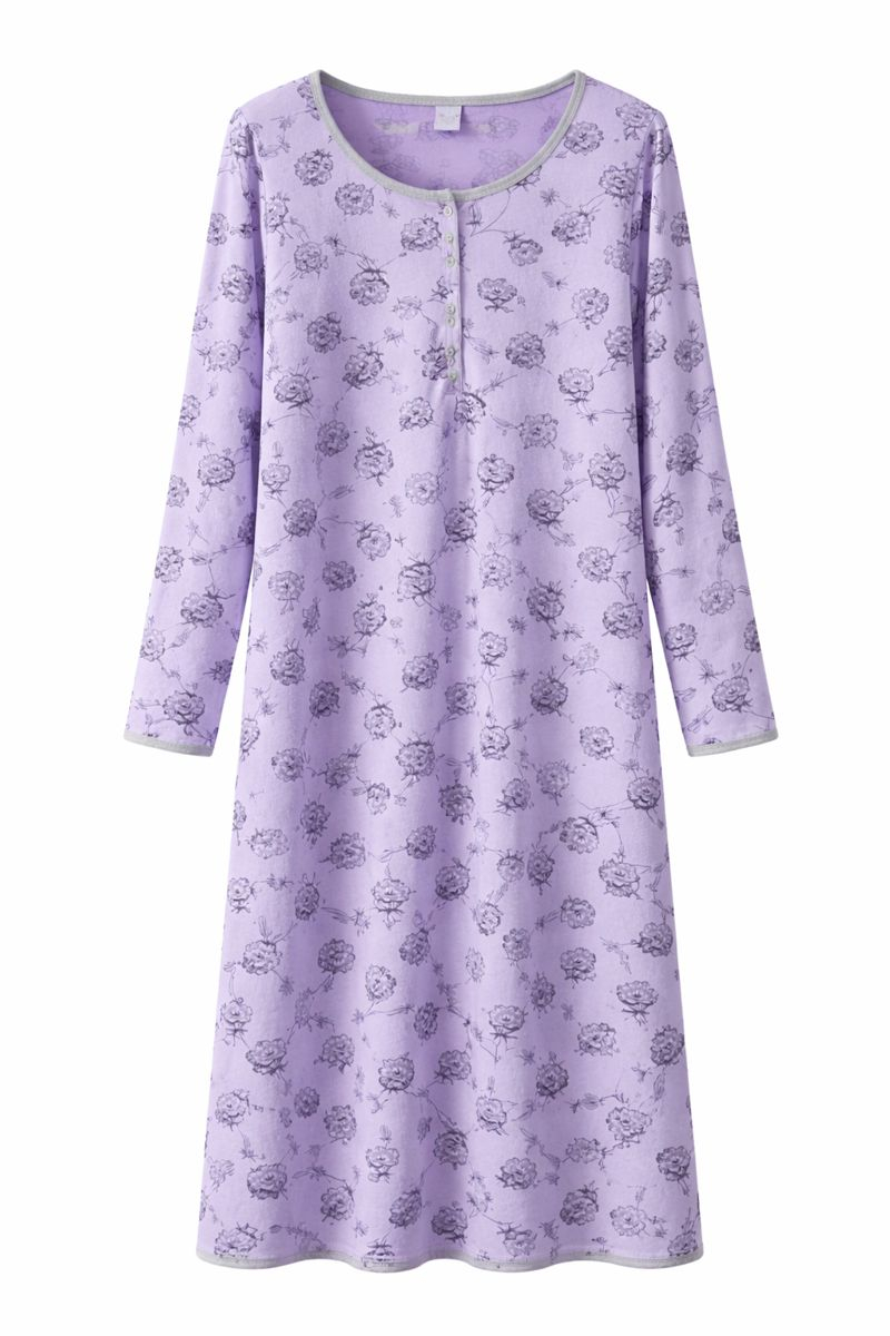 Cămașă de noapte damă, realizată din material moale și plăcut la atingere, ideală pentru somn și momente de relaxare. Croiala lejeră oferă confort pe durata nopții, iar mâneca lungă asigură protecție termică suplimentară. Designul delicat, în nuanță lila, este completat de un imprimeu floral discret și nasturi frontali, pentru un plus de funcționalitate și stil. O alegere practică și feminină pentru purtare zilnică.