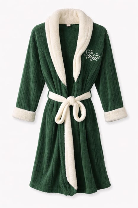 Designul elegant este completat de gulerul și manșetele albe, contrastante, care oferă un plus de rafinament, iar broderia delicată „Shine” adaugă un detaliu feminin și modern. Halatul se închide cu cordon reglabil în talie, asigurând o potrivire comodă și practică.