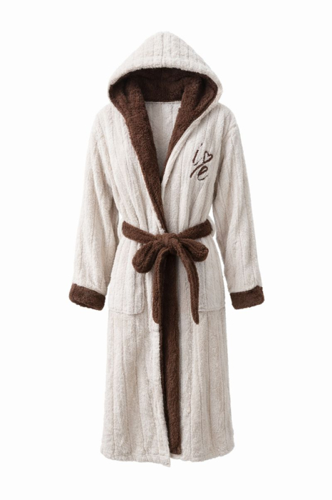 Răsfață-te cu un halat pufos și extrem de confortabil, realizat din material moale și plăcut la atingere. Halatul este prevăzut cu glugă generoasă, detalii contrastante maro, manșete fine și cordon în talie pentru o potrivire perfectă. Broderia delicată „love” adaugă un plus de eleganță și feminitate. Ideal pentru dimineți relaxante, seri cozy sau momente de răsfăț acasă. O alegere perfectă și pentru cadou.