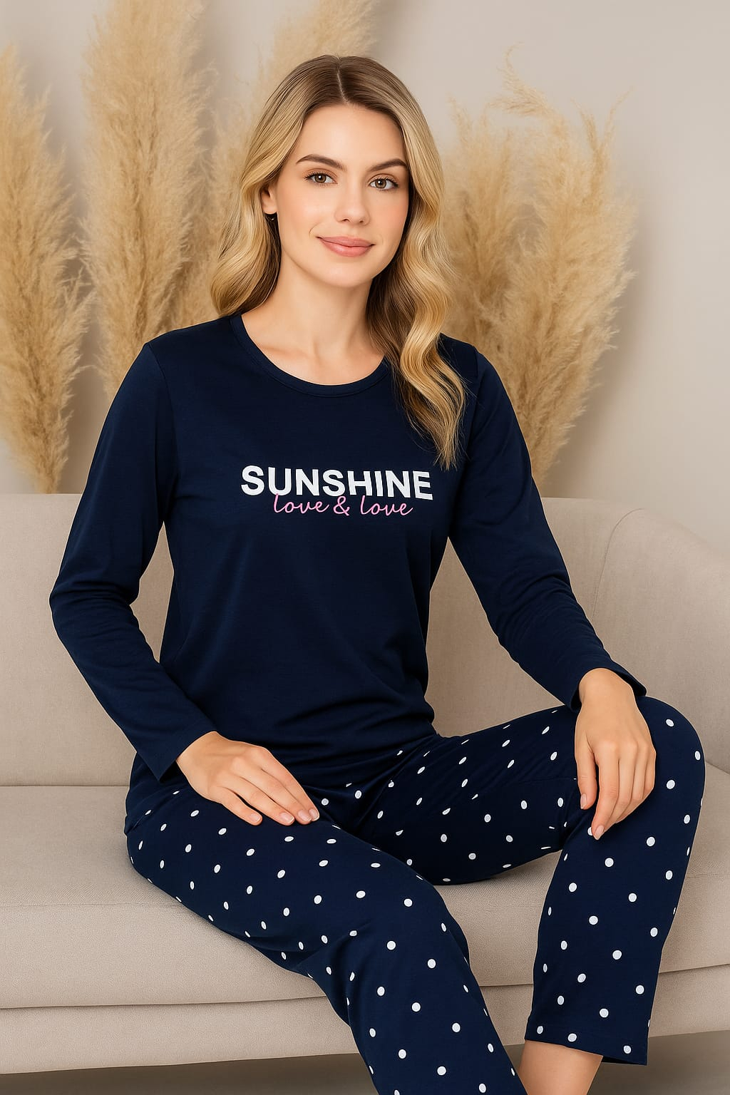 Bluza cu maneca lunga are o croială lejeră , oferindu-ți libertate de mișcare și un aspect relaxat. Pantalonii lungi au o talie elastică pentru o potrivire perfectă și confortabilă, fără a te simți constrânsă. Designul simplu și elegant al acestei pijamale este completat de calitate și confort, asigurându-te că vei adormi într-un confort absolut.