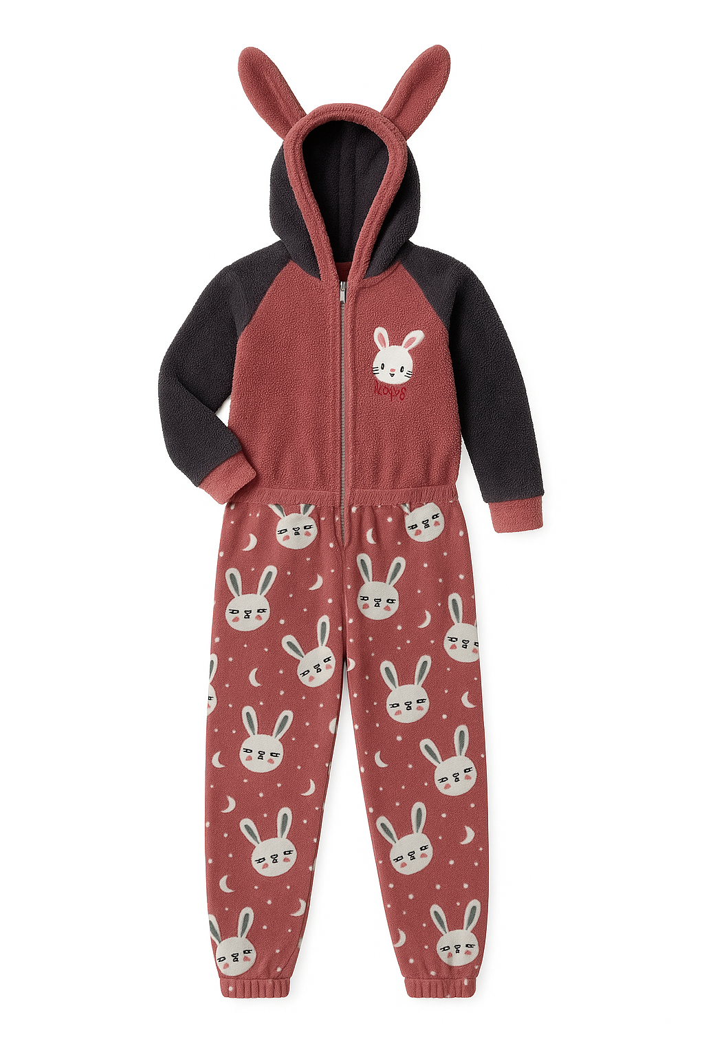 Pijamaua este prevazuta cu fermoar, ceea ce faciliteaza punerea si scoaterea ei. Gluga, care este cea mai distinctiva caracteristica, va va mentine capul cald si confortabil.