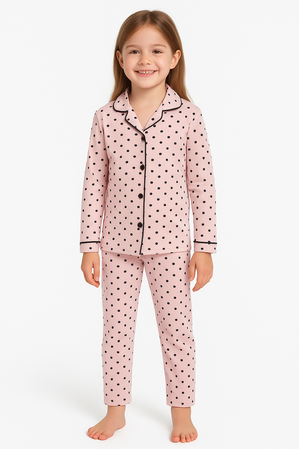Pijama din Bumbac pentru Fete, Roz cu Buline si Nasturi
