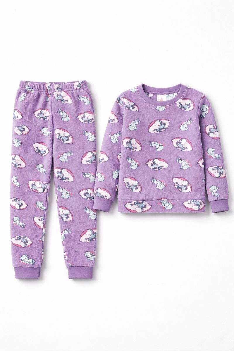 Setul este compus din bluză cu mânecă lungă și pantaloni lungi, decorate cu un imprimeu vesel cu unicorni adormiți pe lună, pe un fundal mov delicat. Bluza are guler rotund și manșete elastice pentru o fixare confortabilă, iar pantalonii sunt prevăzuți cu talie elastică și terminații elastice la gleznă, asigurând libertate de mișcare și menținerea căldurii pe durata nopții.