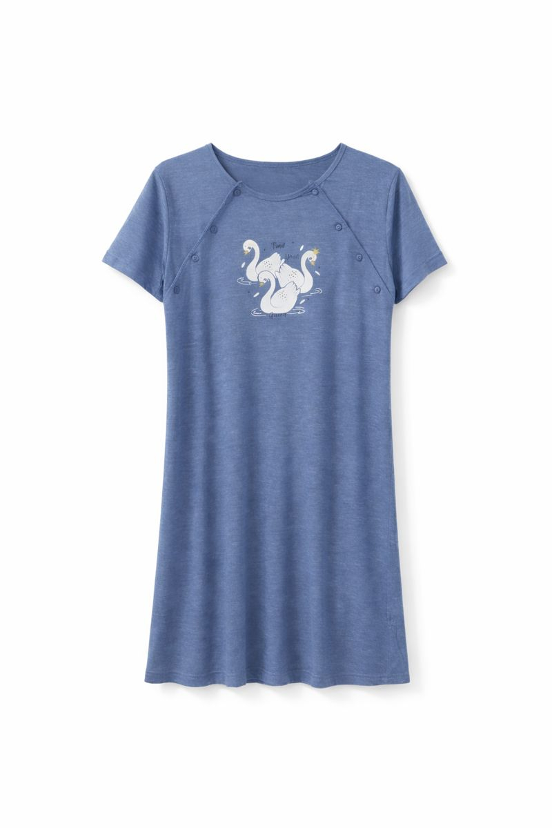 Cămașă de noapte pentru alăptat, cu nasturi laterali, din bumbac, culoare albastru melanj
