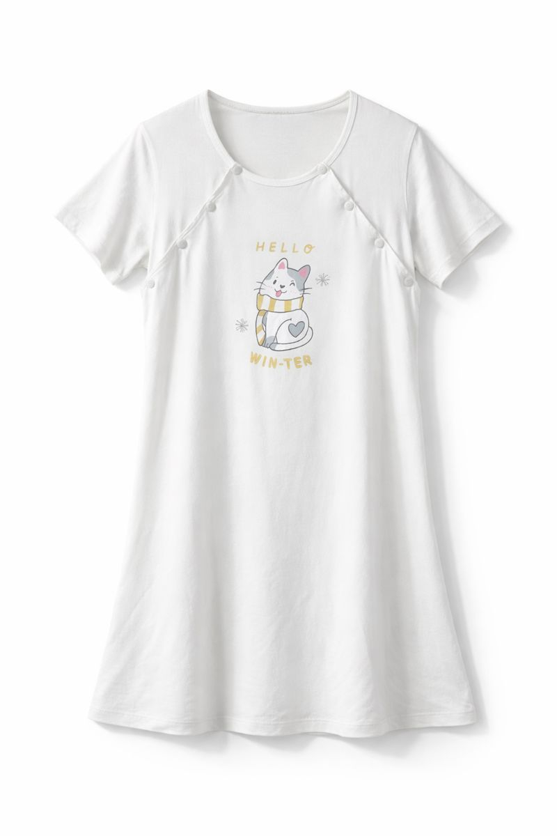 Sistemul practic de deschidere cu nasturi laterali permite alăptarea rapidă și discretă, fără a fi nevoie să scoți complet cămașa. Croiala lejeră și lungimea optimă asigură confort sporit pe timpul nopții, iar imprimeul drăgălaș cu pisicuță adaugă o notă caldă și feminină. Ideală pentru spital, acasă sau ca idee de cadou pentru viitoarele mămici.