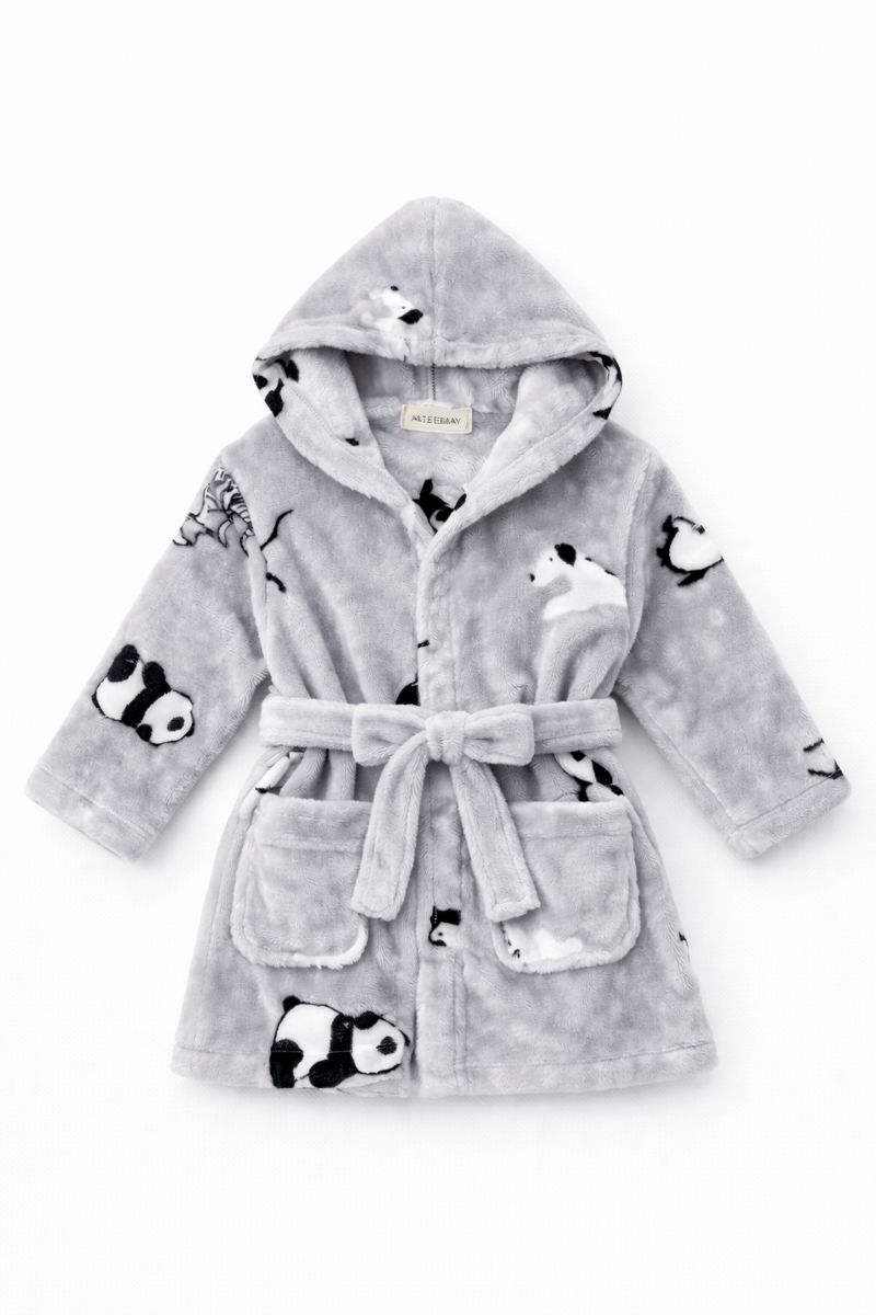 Designul adorabil cu model panda este îndrăgit de cei mici, iar croiala practică îl face ușor de purtat zi de zi. Halatul este prevăzut cu glugă, buzunare frontale și cordon reglabil, pentru o fixare perfectă și un plus de confort.