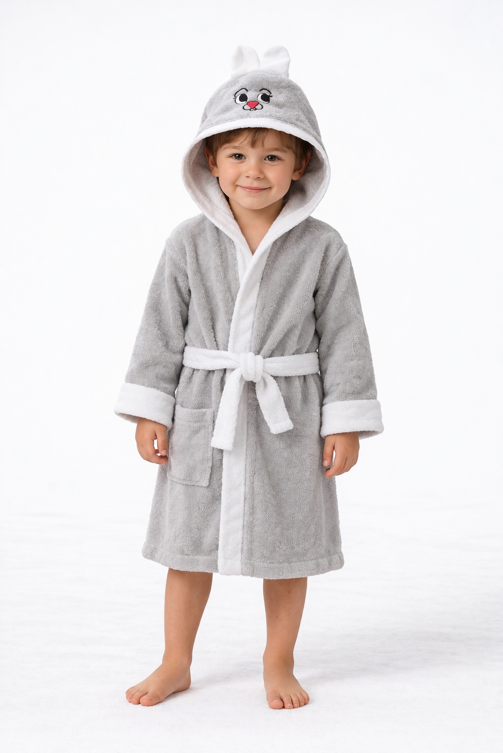 Designul simpatic cu glugă tip iepuraș adaugă un plus de veselie, transformând fiecare moment de după baie într-o experiență plăcută. Halatul este prevăzut cu cordon în talie pentru fixare ușoară și buzunar lateral practic.