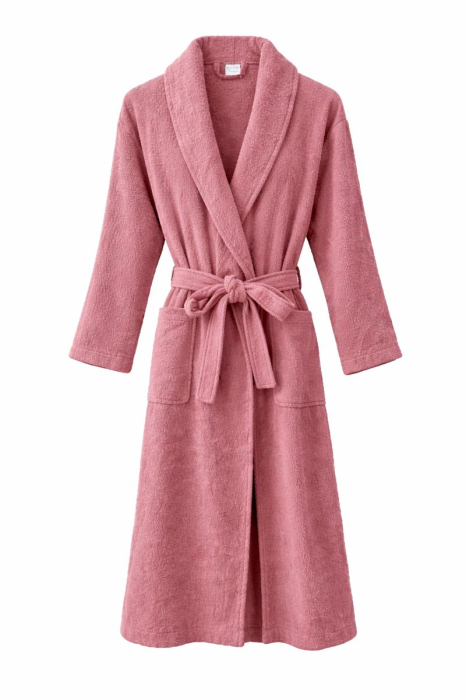 Designul clasic, cu guler tip șal elegant și cordon reglabil în talie, asigură o potrivire comodă și un aspect îngrijit. Culoarea roz prăfuit adaugă un plus de delicatețe și stil, fiind ușor de integrat în orice ambient.