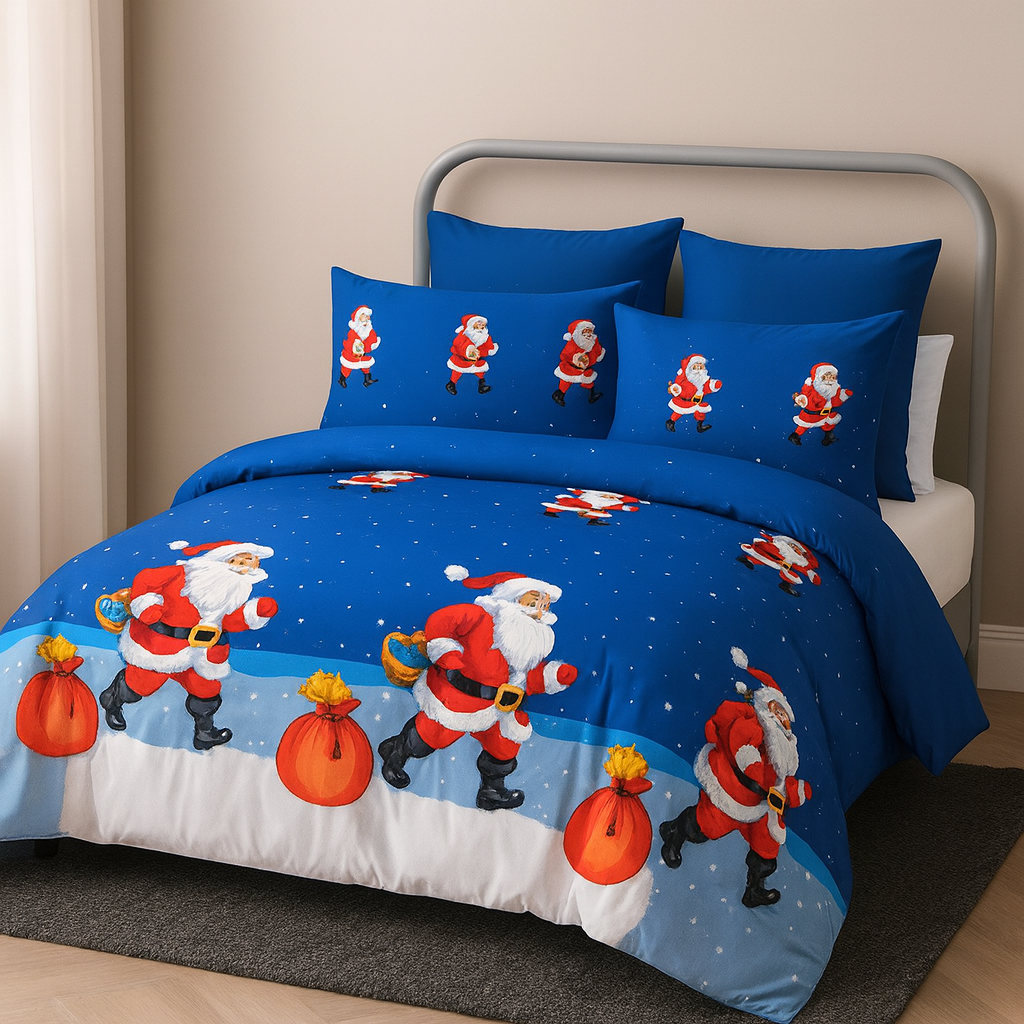 Transformă-ți dormitorul într-o poveste de iarnă cu această lenjerie de pat festivă, realizată din material fin și plăcut la atingere, ideală pentru sezonul sărbătorilor. Imprimeul vibrant cu Moș Crăciun aduce instant magia Crăciunului în orice cameră, fiind perfectă atât pentru copii, cât și pentru adulți care adoră atmosfera festivă.