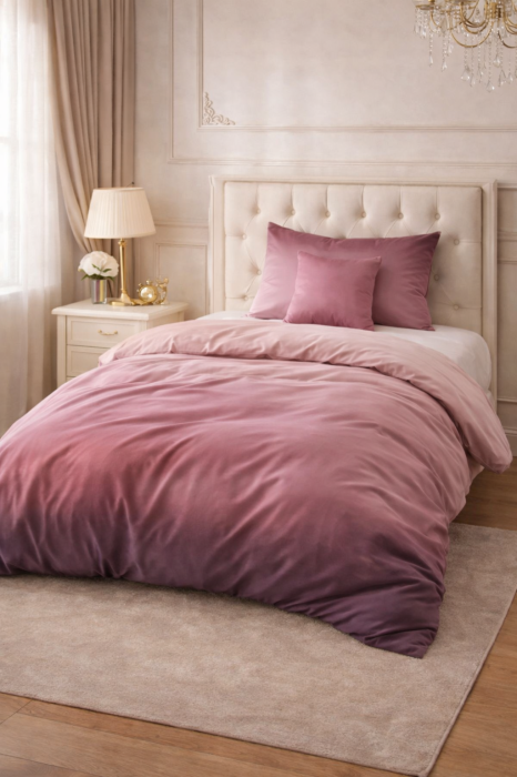 Adaugă un plus de eleganță și rafinament dormitorului tău cu această lenjerie de pat modernă pentru o persoană. Designul în nuanțe degradé de roz, de la tonuri deschise până la burgundy, creează un efect vizual plăcut și relaxant, potrivit pentru un decor sofisticat.