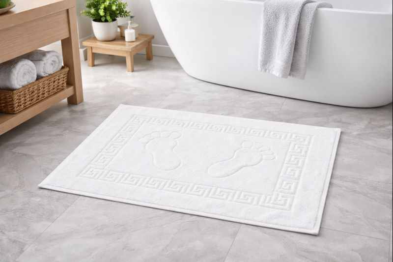 Covoraș de baie din bumbac premium, alb, cu model în relief – Pași & Bordură Grecească